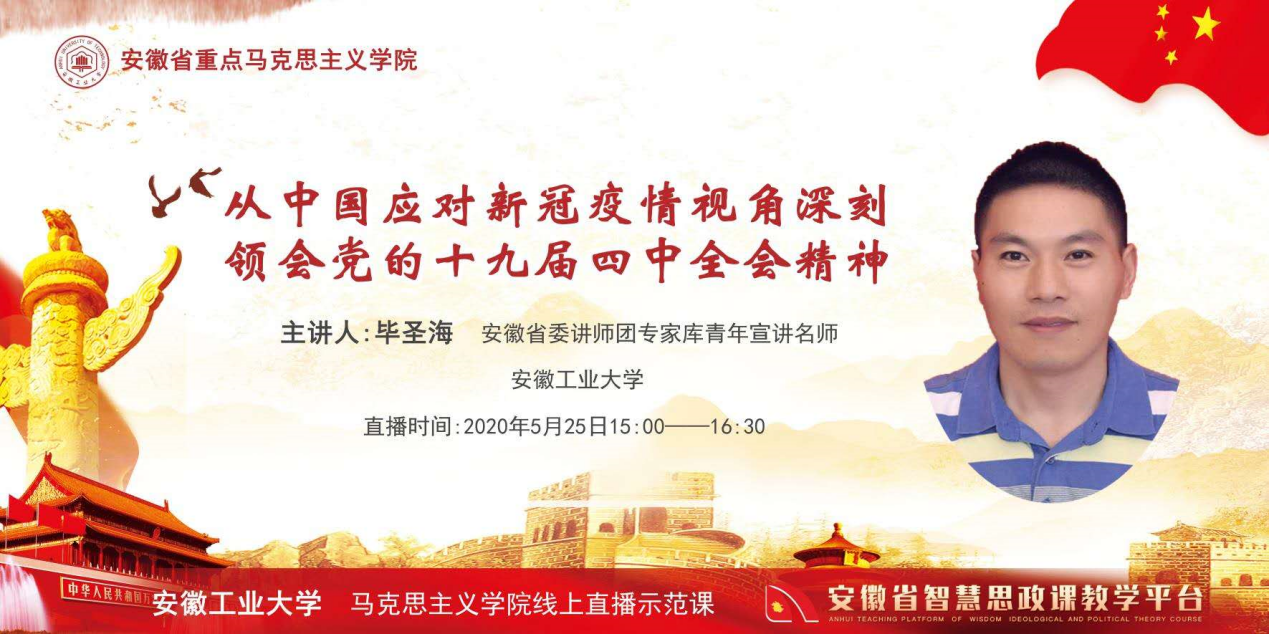 5月25日下午,我院优秀党员教师、省委讲师团青年宣讲名师毕圣海,在安徽省智慧思政课教学平台开展了全省线上直播公开课。结合本学期将疫情防控融入《毛泽东思想和中国特色社会主义理论体系概论》教学要求,他选择的讲授专题是《从中国应对新冠疫情视角深刻领会党的十九届四中全会精神》。