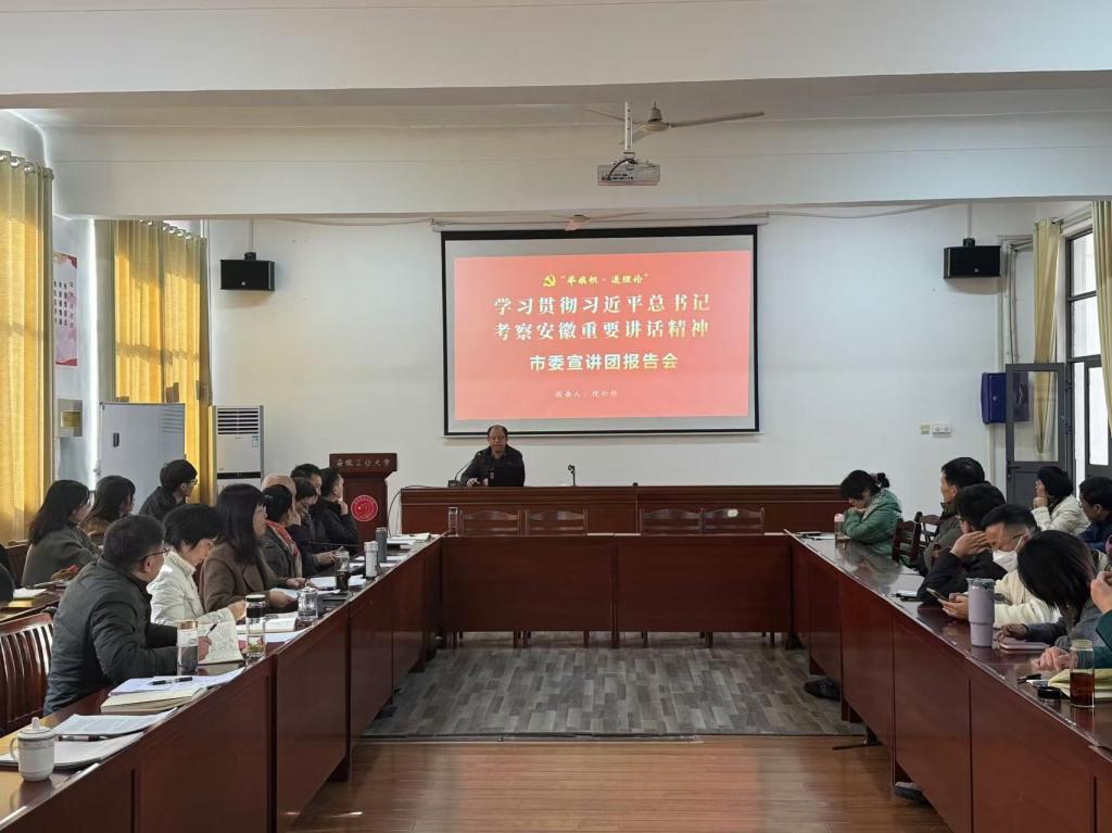 为深入学习宣传贯彻习近平总书记考察安徽重要讲话精神,11月28日,必赢线路检测3003no1在学院325报告厅举办学习贯彻习近平总书记考察安徽重要讲话精神宣讲报告会,市委讲师团倪松根老师应邀作宣讲报告。会议由学院党委书记徐惠主持,学院全体教职工出席了会议。