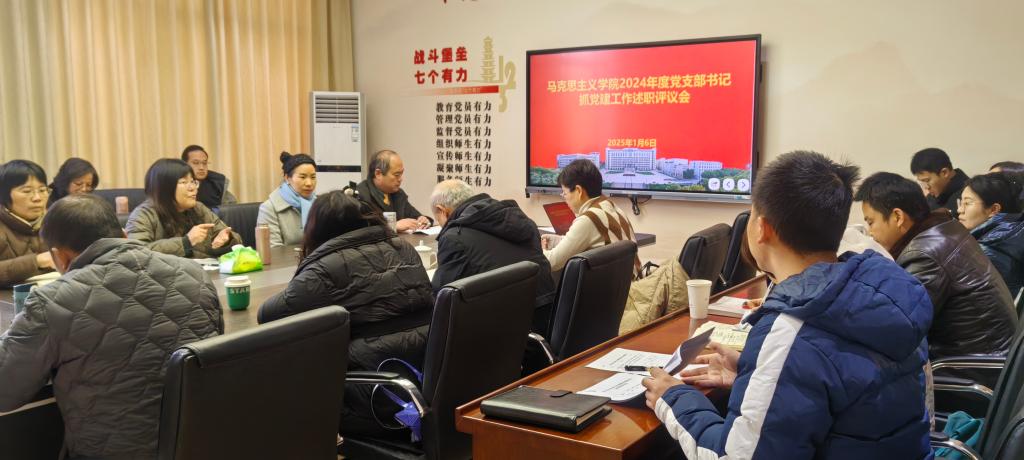 述职采取“一述一评”的形式进行。马克思主义基本原理教研室党支部、习近平新时代中国特色社会主义思想概论教研室党支部、毛泽东思想和中国特色社会主义理论体系概论教研室党支部、中国近现代史纲要教研室党支部、思想道德与法治教研室党支部、研究生党支部等6个党支部书记分别围绕2024年支部主要工作成效、存在的问题、下一步工作思路和措施等方面内容,采用PPT汇报的形式展开述职。徐惠逐一对各党支部书记述职情况进行点评,充分肯定了各党支部取得的成绩,同时也指出了存在的不足和下一步努力的方向。