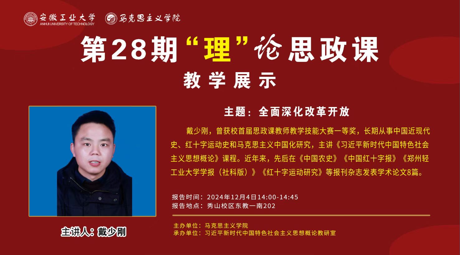 本次教学观摩活动由“新思想概论”教研室戴少刚老师展示,他展示的专题为第五章“全面深化改革开放”。