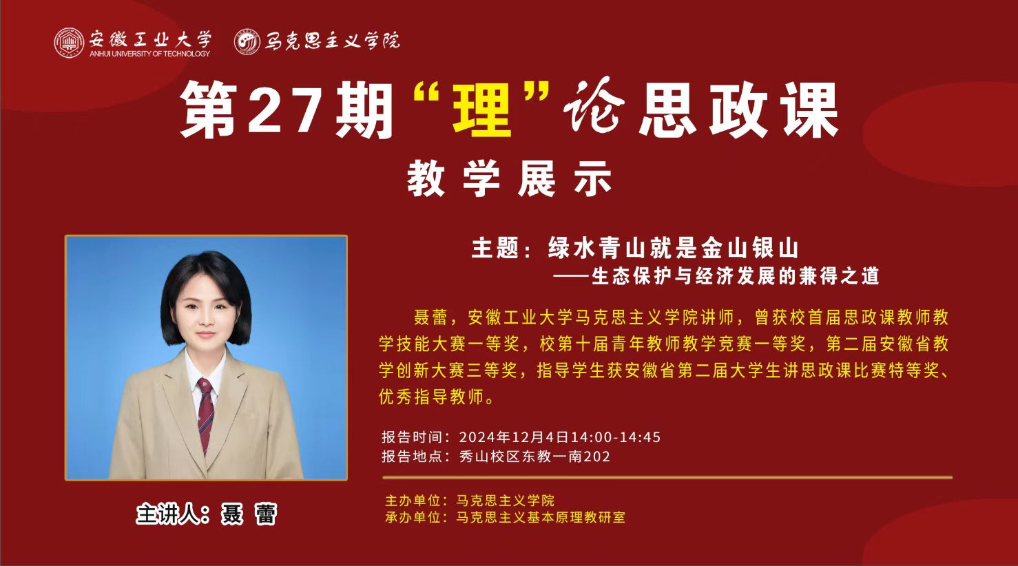 本次教学观摩首先由“原理”教研室聂蕾老师展示,她展示的主题是“绿水青山就是金山银山——生态保护与经济发展的兼得之道”。她以马克思主义基本原理科学社会主义部分——科学社会主义基本原则之要合乎自然规律地改造和利用自然,努力实现人与自然的和谐共生这一原理为切入点,以跨省流域生态保护补偿的“新安江模式”为主线,探究“生态保护与经济发展”能否兼得?为何兼得?如何兼得?剖析生态保护与经济发展之间关系,进而引导学生们深刻理解生态与经济兼顾是中国新发展逻辑。作为中国式现代化的推进力量,新时代青年必须牢固树立绿水青山就是金山银山的理念,共担生态文明使命,共建美丽富强中国。