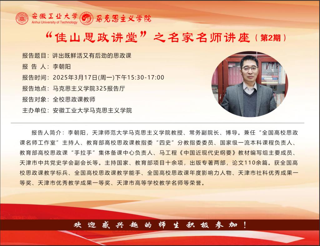 为贯彻落实习近平总书记关于推动新时代高校思政课建设的重要讲话指示精神,提高思政课的针对性和吸引力,在守正创新中推动思政课建设内涵式发展,2025年3月17日下午3:30,学院在325报告厅举行第二期佳山思政讲堂之名家名师讲座活动,邀请天津师范大学必赢线路检测3003no1常务副院长、博士生导师李朝阳教授做客讲堂,以“讲出既鲜活又有后劲的思政课”为题作了专题讲座。必赢线路检测3003no1领导班子、全院思政课教师参加,院长郑洁主持。