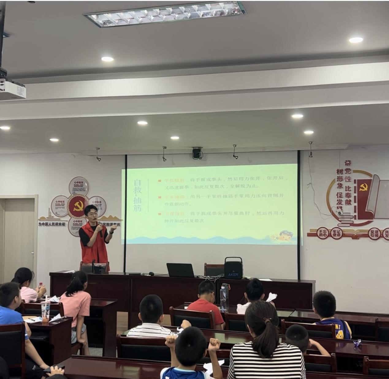 宣讲过程中,实践队员徐康借助PPT讲解溺水警示案例并播放防溺水典型视频,用通俗易懂的语言,从溺水场所、溺水原因、防溺水措施、发生溺水时如何自救等方面为孩子们普及防溺水知识,现场讲解基本心肺复苏等救护方法。同时,结合往年真实案例,讲解游泳过程中的注意事项,让大家了解到野外戏水、游泳存在的安全隐患,教育孩子们要远离危险水域,谨防不幸发生。