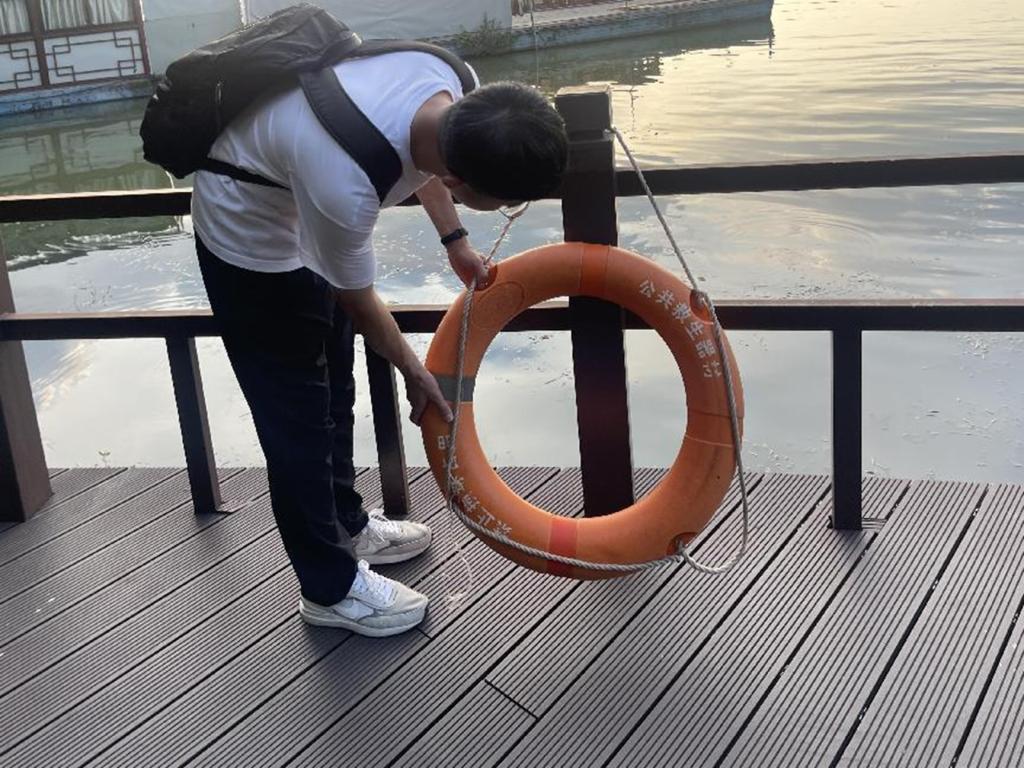 暑期实践队员对社区内河流、湖泊等重点水域进行安全隐患排查,在社区重点水域范围内检查警戒线、救生圈、警示牌、竹竿等救援标识和设备是否齐全,并向来往居民发放宣传资料,普及溺水救援知识及时劝导游泳戏水居民,降低溺水风险,以防意外发生。