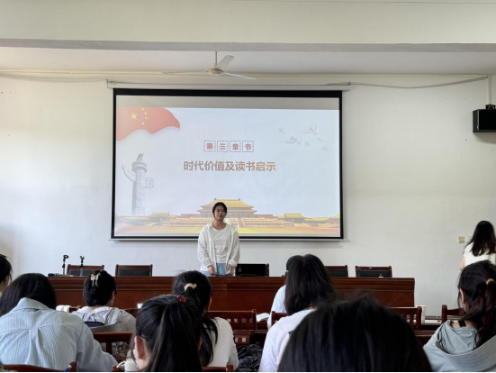 第三小组的刘燕、李梦真同学分享的篇目是《实践论》,从撰写初衷、理论解读、研究现状、自我感悟等层面展开读书汇报。该小组同学从唯物辩证法的角度重点解读了实践与认识相互转化的过程以及认识与实践的规律,并从思想政治教育切入,指出思想政治教育要解决好如何教会学生用马克思主义认识论去指导实践的问题,号召研究生们要关注现实、知行合一。