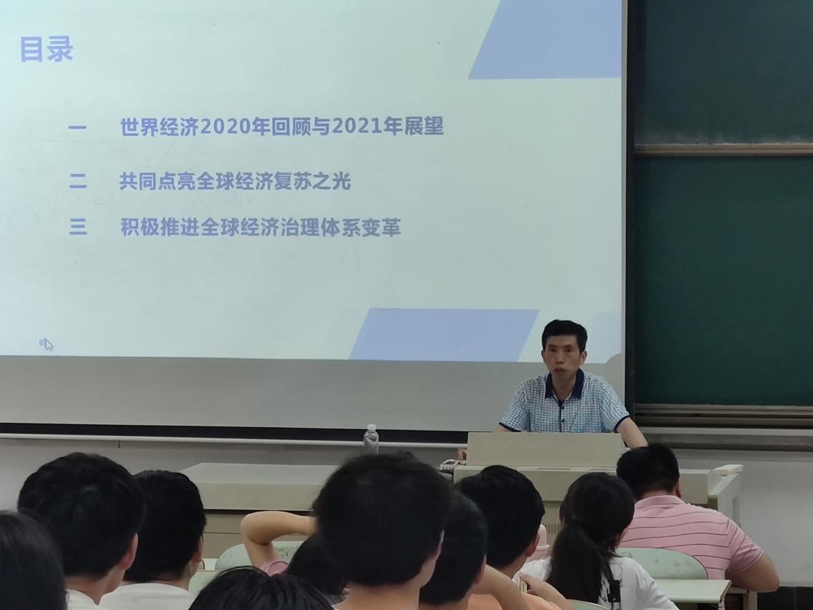 水恒福向同学们详细介绍了2020年受新冠肺炎疫情影响下美国、欧洲、日本、新兴经济体等国外主要经济体的经济发展状况。各国为促进经济复苏,通过实行超宽松货币政策、加快数字经济发展、推进绿色经济转型、加强国际合作等有效措施共同点亮全球经济复苏之光。水恒福指出面对当前世界政治经济格局正发生着的深刻变化,全球价值链及其重构正影响和改变着当前世界经济秩序,中国应当积极参与全球经济治理体系改革,为推动完善更加公平合理的国际经济治理体系的重构与建设贡献中国智慧。