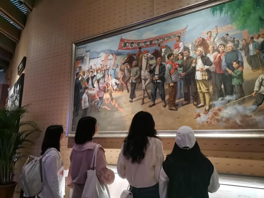 16日上午,同学们在渡江战役纪念馆前的解放广场,瞻仰了邓小平、刘伯承、陈毅、粟裕、谭震林五位总前委成员巨型塑像。高大的群雕生动形象地展现了五位总前委运筹帷幄、决胜千里,指挥百万雄师横渡长江天堑的雄才大略与宏伟气度。透过厚重的历史,同学们心灵上受到了强烈的震撼和巨大的鼓舞,同时也激发了他们为实现中华民族伟大复兴而努力奋斗的豪情壮志。纪念馆内,组织委员管明雪带领全体党员,面向鲜红的党旗,高举右拳,重温了入党誓词。接着,在讲解员的带领下大家依次参观了战前形势、战役准备、突破江防、战役胜利、人民支前和英烈业绩六大主题展厅,从一张张生动鲜活的照片、一件件饱经战火的实物、一尊尊栩栩如生的雕塑中,进一步了解了革命先烈立下的不朽功勋和伟大业绩,深深地感悟了他们面对困难不妥协、勇往直前的革命精神。