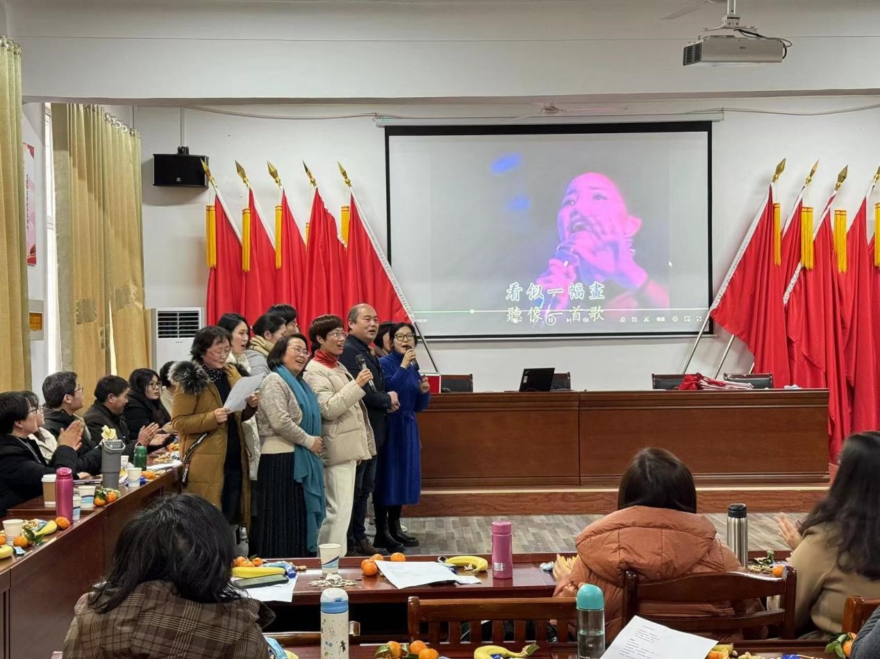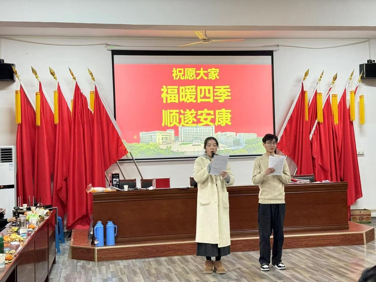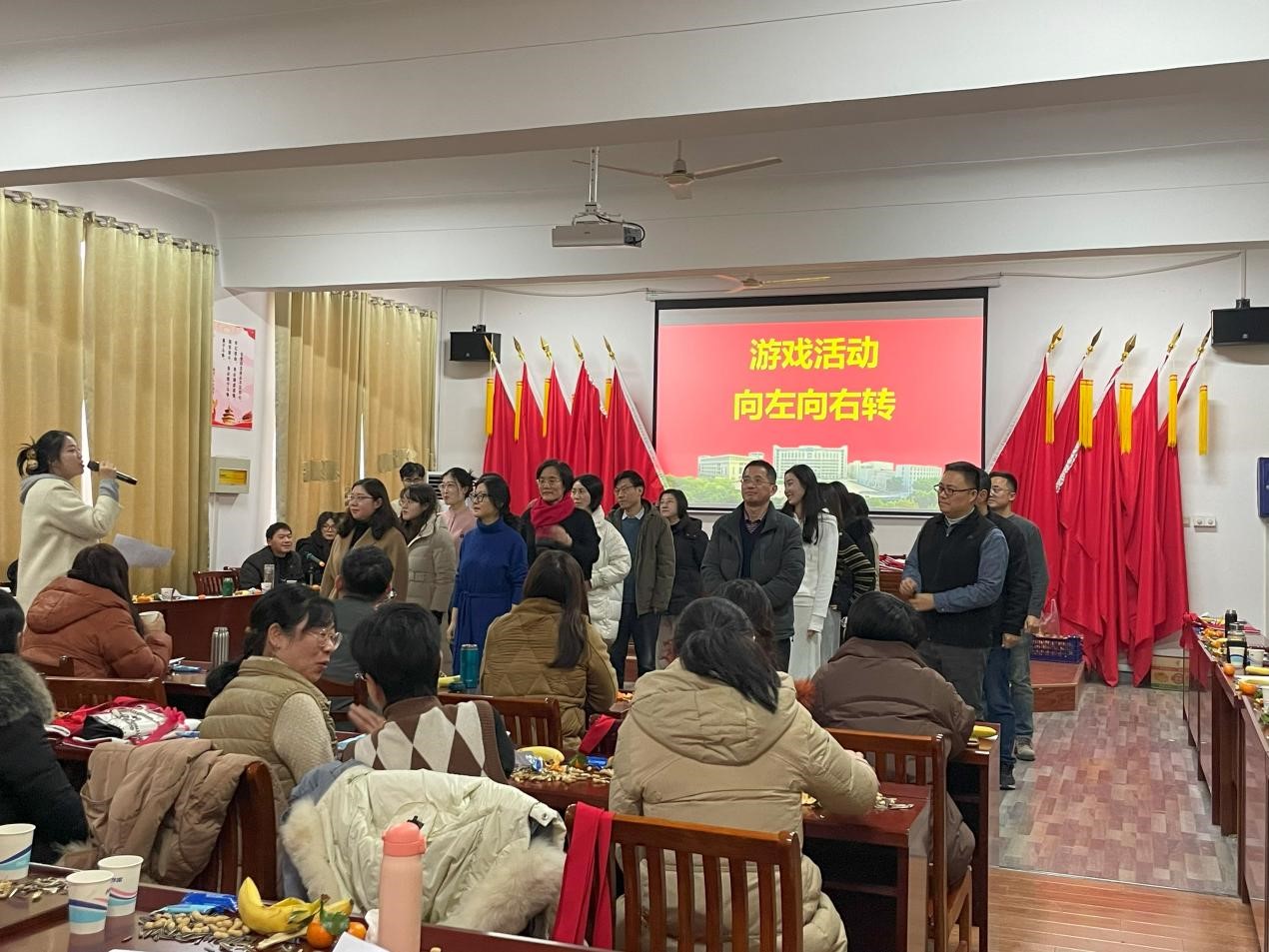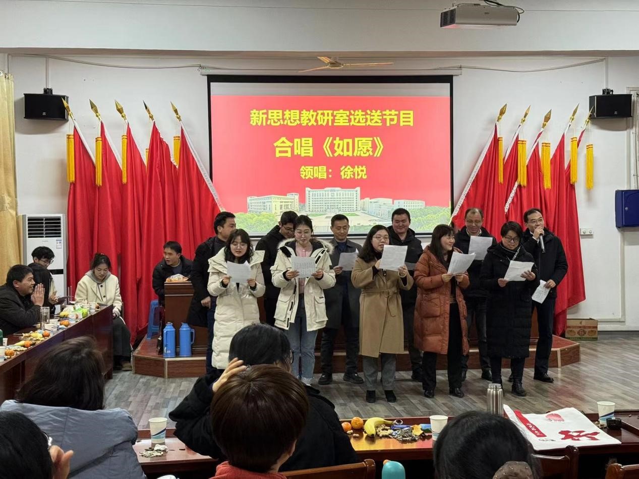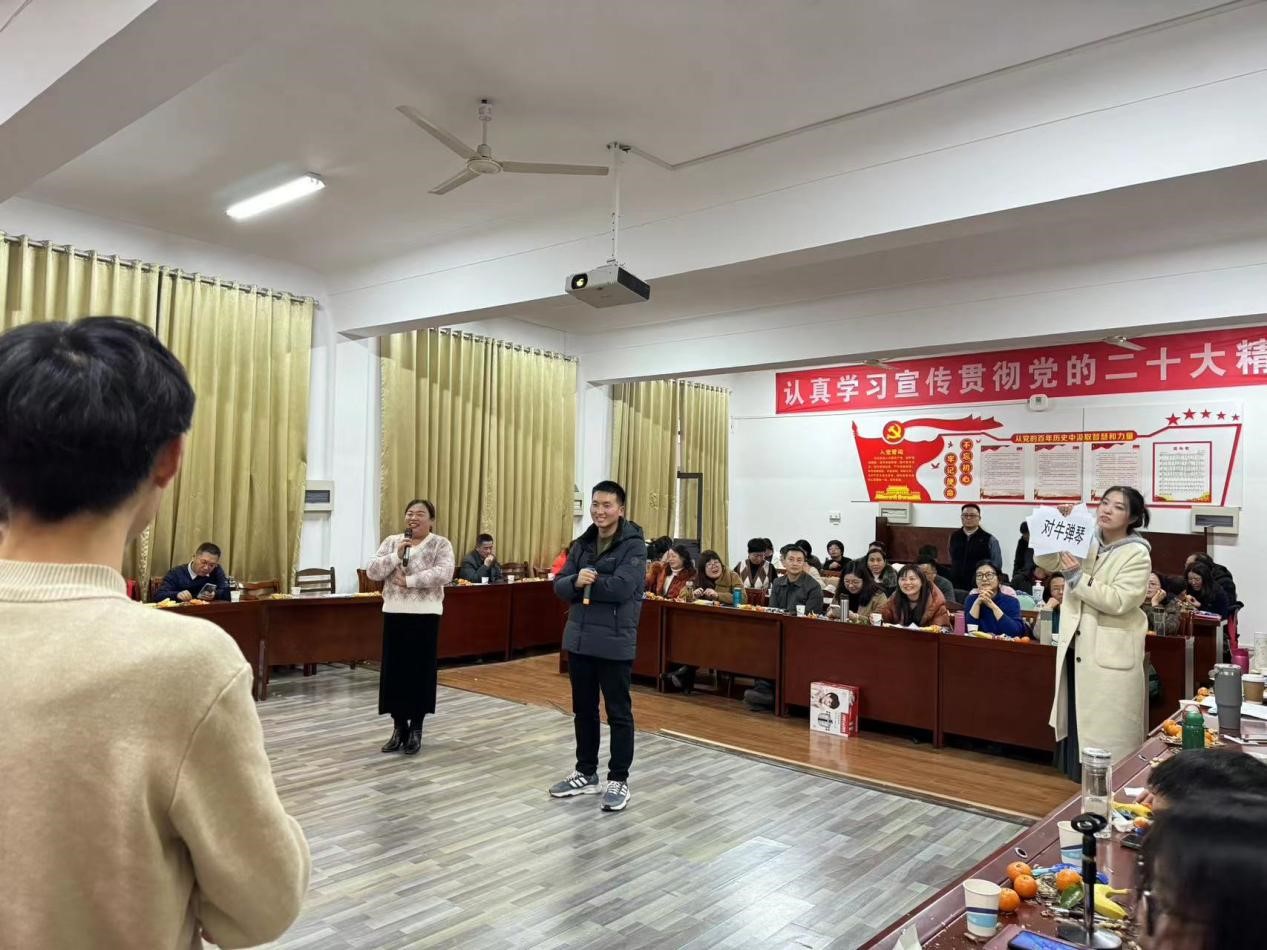 本次活动由青年教师吴少华和沈嘉仪主持。共分三个篇章,汇聚了各教研室精心编排的优秀节目。原理教研室的经典朗诵《共产党宣言》,展现了不惧艰难,为共产主义事业奋斗终生的坚定信念;新思想教研室的合唱《如愿》,表达了不负期望的人生态度;德法教研室的合唱《小城故事》,传达了温暖人心的情感;概论教研室的合唱《相亲相爱》,鼓励大家携手共建团结马院;纲要教研室的合唱《遇见你是我的缘》,重温了因缘而聚的场景;工会委员及全体教师的合唱《团结就是力量》,呼吁马院团队携手并进,朝着共同目标努力奋进。同时,联欢会穿插了“向左向右转”“逢3拍”“你比我猜”等若干游戏活动。整场联欢会主题鲜明、歌声不断、祝福连连。大家跟随音符的跳动、旋律的交响,掌声、欢呼声连绵不断。充分展现了安工大马院人朝气蓬勃、昂扬向上的精神风貌。