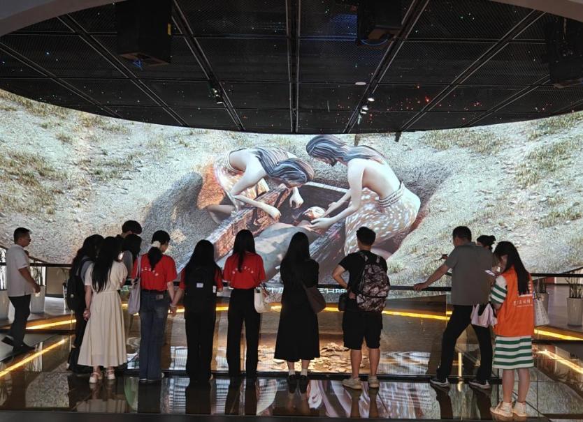 在数字体验区,队员们通过虚拟现实技术目睹了先民以玉祭天的神圣场景。裸眼3D技术将玉鹰纹饰拆解重组,八角星纹中的数学奥秘在光影变幻中被层层揭示。戴堃同学在体验后感慨:“数字化让文明变得可触可感,我们仿佛能听到远古先民的‘文化心跳’,这为思政教学提供了生动素材。”调研结束后,实践队成员张兆华同学不禁感叹:“站在5300-5800年前的文物前,我不仅惊叹于先民的工艺,更思考着社会组织能力。凌家滩遗址博物馆用1100件文物、4000平方米展厅和前沿数字技术,向我们讲述着中华文明五千多年的故事。”