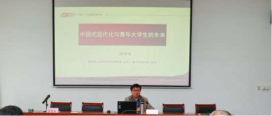 徐仲伟教授做了题为“中国式现代化与当代青年学生的未来”的主题报告,全面梳理了中国式现代化的本质要求和基本遵循,从政治、经济、社会、生态文明、科教人才、国防、外交、党的建设等方面阐述了中国式现代化的主要任务;结合自身人生经历,勉励广大青年学生树立理想信念、担当历史使命,自觉投身中国式现代化的伟大实践,不断开创中国式现代化新局面。